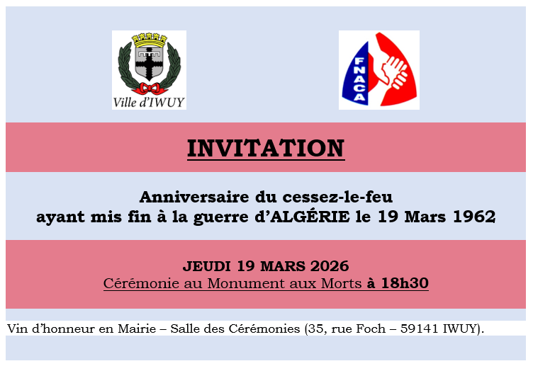 Jeudi 19 mars 2026 : Cérémonie - Anniversaire du cessez-le-feu ayant mis fin à la guerre d'Algérie
