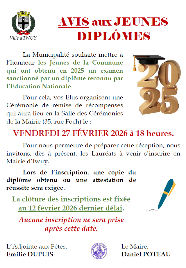 Cérémonie des Jeunes diplômés 2025 - Vendredi 27 février 2026 à 18 heures - Inscriptions avant le 12 février 2026 dernier délai