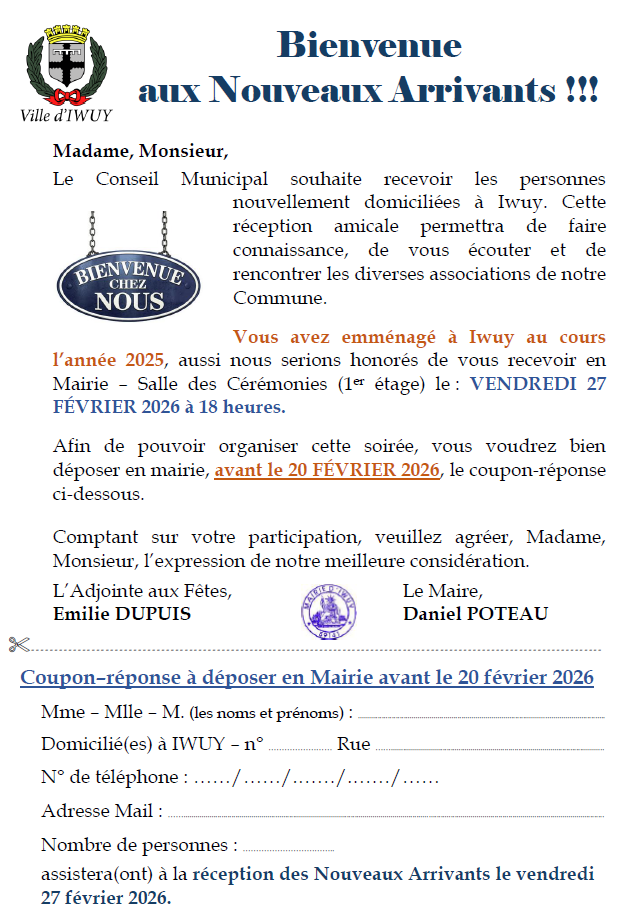 Cérémonie des Nouveaux Arrivants 2025 - Vendredi 27 février 2026 à 18 heures - Inscriptions avant le 20 février 2026
