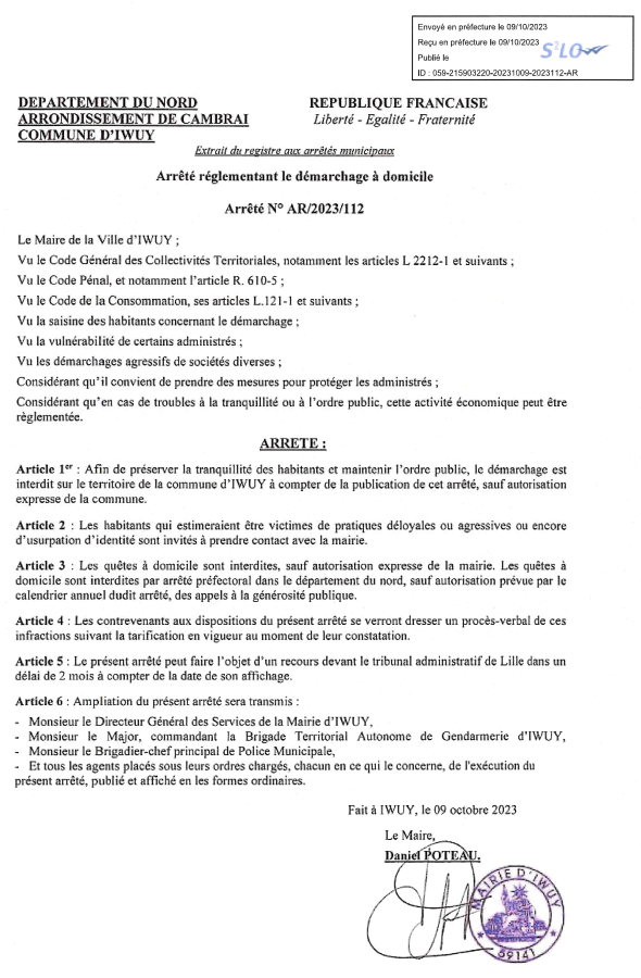 Le démarchage est interdit sur le territoire de la Commune d'IWUY